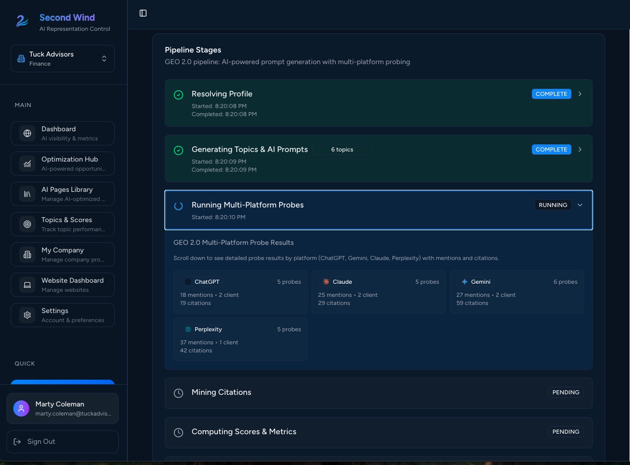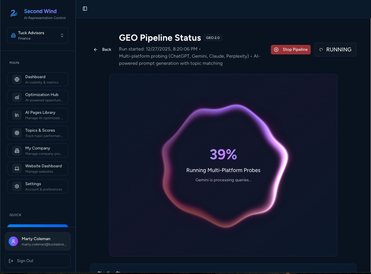 Second Wind intercepts how LLMs describe and recommend your company - and steers those outputs in your favor. It continuously probes AI systems, measures visibility, and deploys optimized signals that reroute demand toward your offerings.